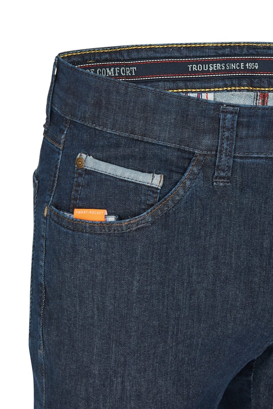 Echte Five-Pocket mit elastischem Komfortbund in strapazierfähigem Light-Denim mit super elastischem High-Stretch. Dieser nur 7,5 oz schwere Summer-Denim ist super leicht und damit ideal für warme Sommertage. Dank einer Beimischung von PBT-High-Tech-Faser sind diese Hosen einzigartig strapazierfähig. Das ist gerade bei leichten Sommer-Qualitäten unerlässlich und zeichnet echte Premium-Qualitäten aus. Dazu kommt, dass diese Hosen dank superelastischen HIGH-Stretch jede Bewegung mitmacht, ohne dass man auch nur einen Hauch von Widerstand spürt. Dieses Modell verfügt über eine normale Leibhöhe und ein schlankes Bein bei schmaler Fußweite. Der Clou: In der rechten Vordertasche ist eine separate Mobile-Pocket eingearbeitet, in der man sein Smartphone kratzsicher und schnell griffbereit unterbringen kann. Dazu die zusätzliche Leistentasche mit Knopf hinter der rechten Gesäßtasche.